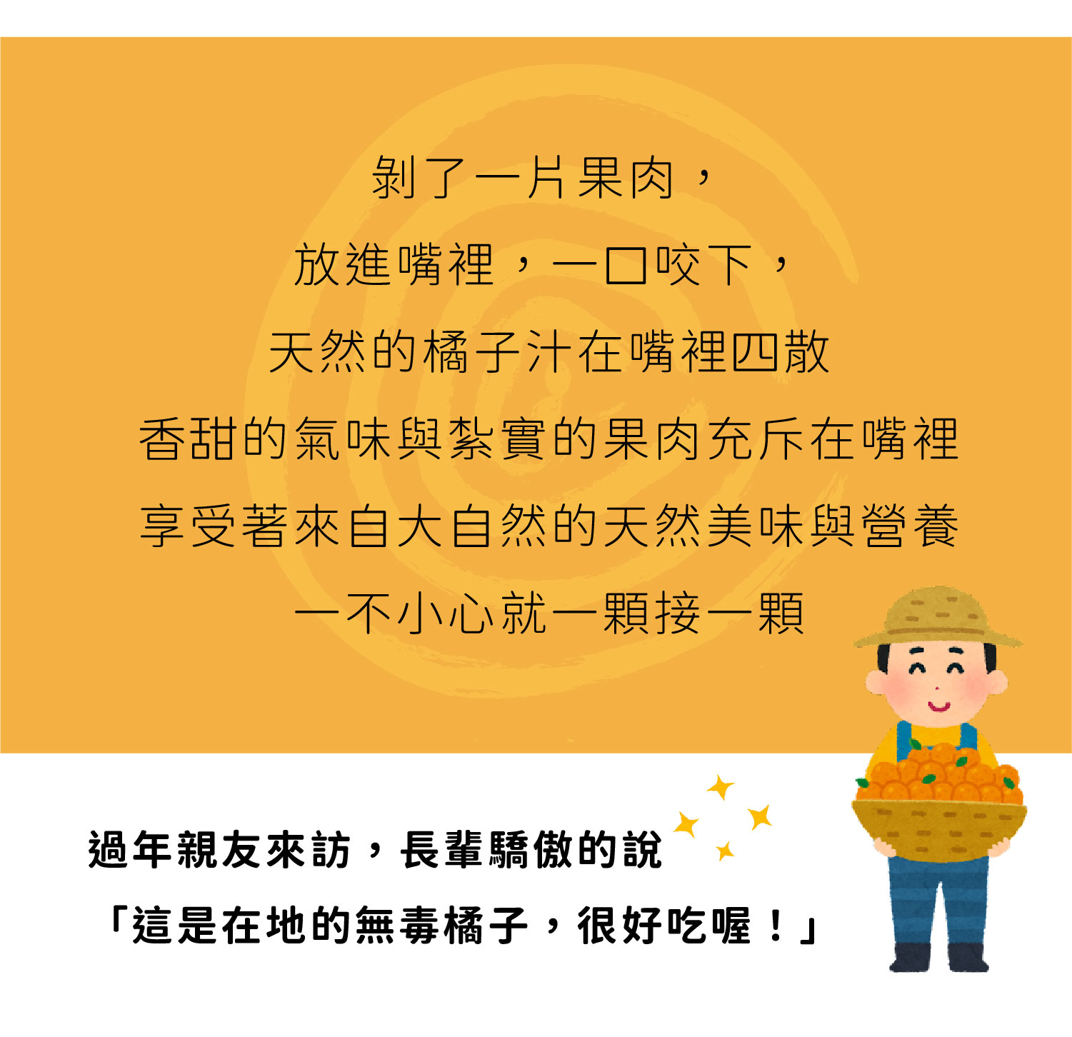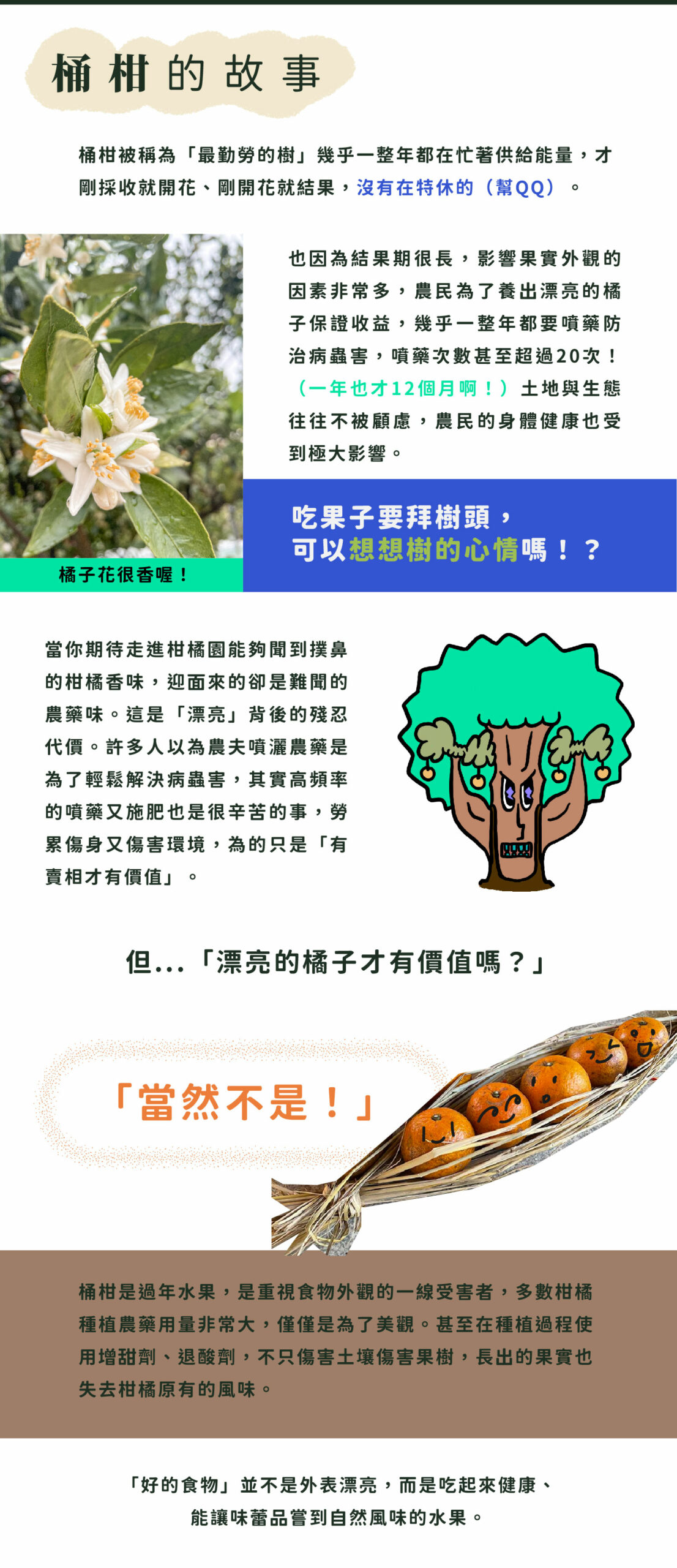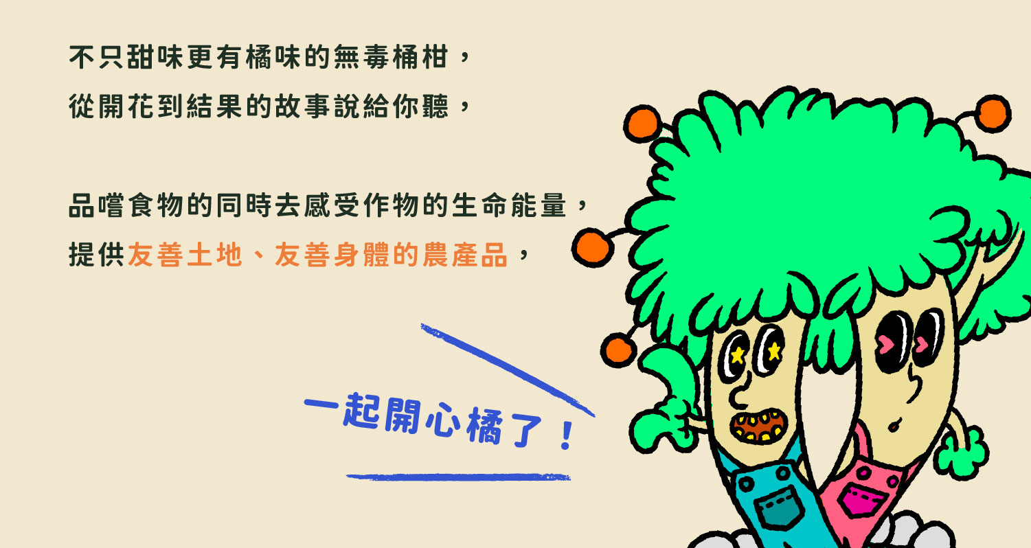 不只甜味更有橘味的無毒桶柑,從開花到結果的故事說給你聽,品嚐食物的同時去感受作物的生命能量,提供友善土地、友善身體的農產品,一起開心橘了!